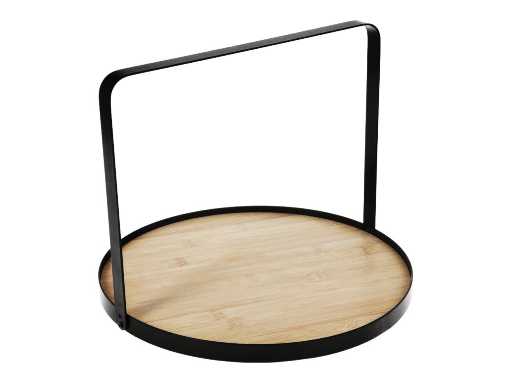 Stylový servírovací podnos vyrobený z kvalitního bambusu s elegantním černým kovovým rámem a držadlem. Ideální pro servírování nápojů nebo jídla s nádechem přírodního designu.