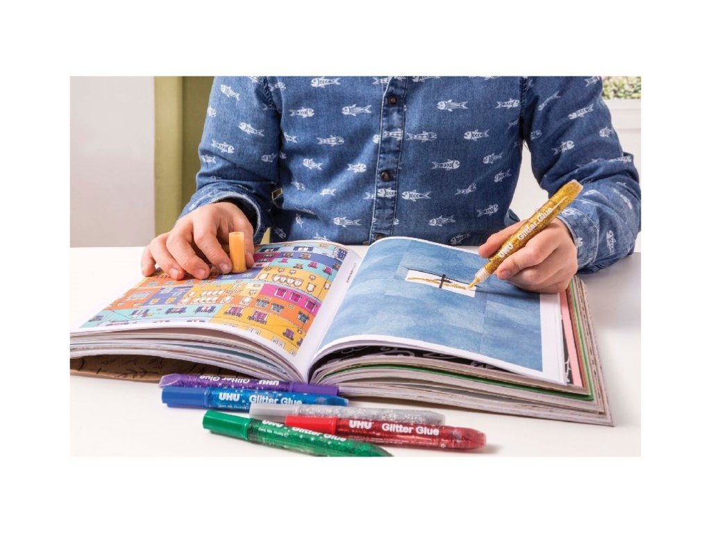 Popis produktu: Barevná kreativní sada UHU Glitter Glue Original přináší krásný třpytivý efekt! Lepidlo obsahuje třpytivé částečky, které po zaschnutí drží na aplikovaném místě a vytváří krásné efekty. Extra měkká tuba s přesným aplikátorem umožňuje snadné a čisté nanášení a nekape. Je bez rozpouštědel a je omyvatelné. Dermatologicky testováno - nejedná se však o kosmetický přípravek. Při styku s kůží opláchněte vodou.Rozsah použití: Dekorovat můžete celou řadu materiálů, včetně kraslic. Vyrobte si vlastní PF, gratulaci, ozdobte si rámeček na fotografii. Pouze sejměte uzávěr – a dejte se do zdobení!Návod k použití: • Vyjměte dávkovací tužky z obalu, dejte je do skleničky dnem vzhůru, aby mohl gel stékat do aplikátoru. • Tužky jsou z měkkého materiálu a dobře se s nimi pracuje. • Lehkým stisknutím vytlačujte gel s flitry a pište, malujte, kreslete. • Gel je bez rozpouštědel a schne dle okolní teploty a množství nánosu - 4 - 6 hodin. • Po zaschnutí je gel pryč a zůstane pouze vrstva krásných třpytek.