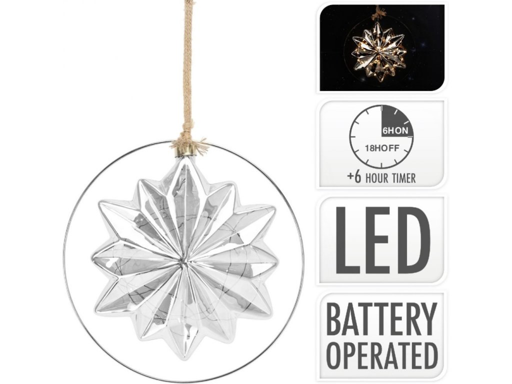 Vánoční dekorace hvězda svítící kouřově šedá, 18.5X8X21.5CM, vzdálenost žárovek 5 cm, přívodní kabel 80 cm, provoz na 3 x AA baterie (nejsou součástí balení), časovač 8 hod. zapnuto / 16 hod. vypnutoDoplňkové parametry