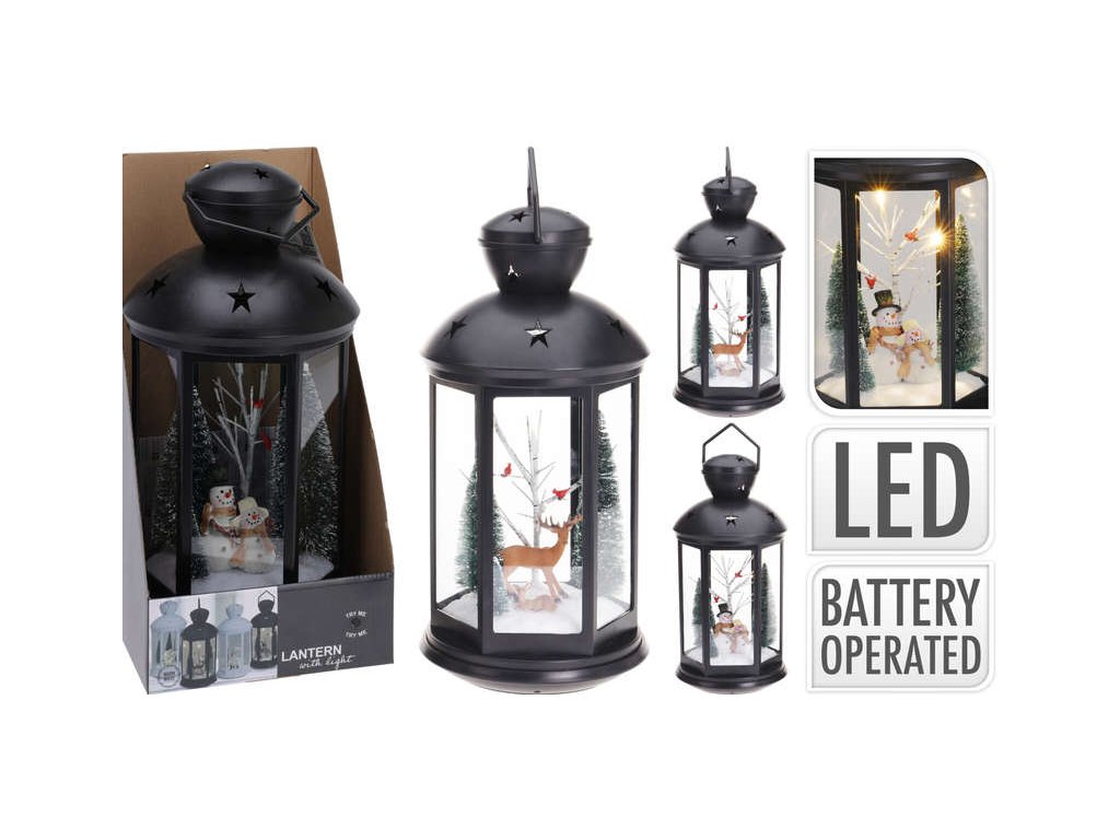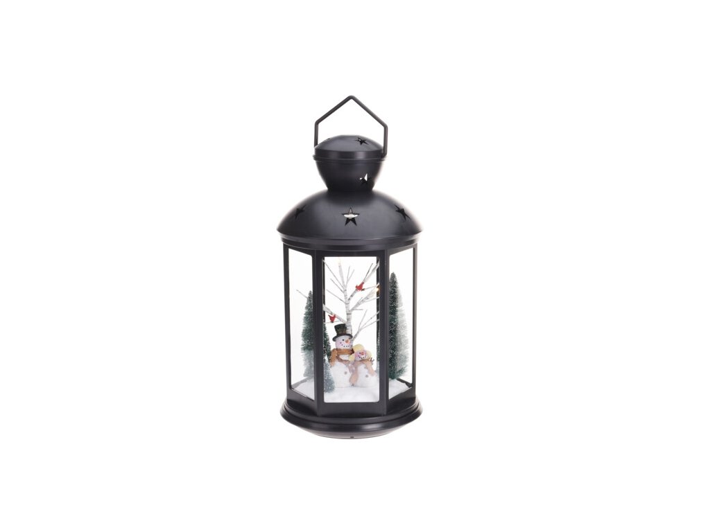 - uvnitř lucerny zasněžená vánoční scenérie se sněhulákem a stromky