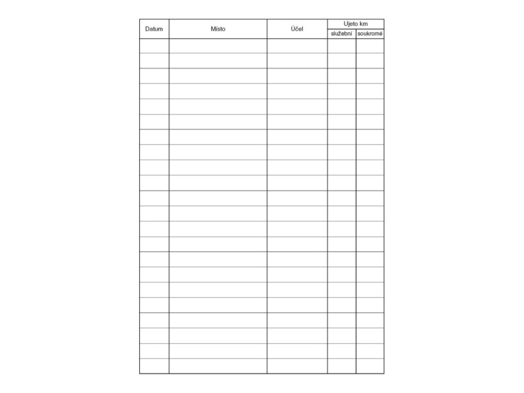 kniha jízd firemního i soukromého vozidla. Nepropisující tiskopis. Vyrobeno z recyklovaného papíru, vnitřní listy s oboustranným černým tiskem. Vazba V1.Doplňkové parametry