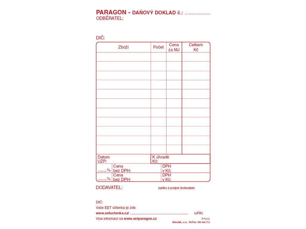 Přímopropisující tiskopis. Je přizpůsoben pro EET evidenci. Vnitřní listy s červeným tiskem. Lepený blok. Rozměr: 80 x 150 mm.Doplňkové parametry