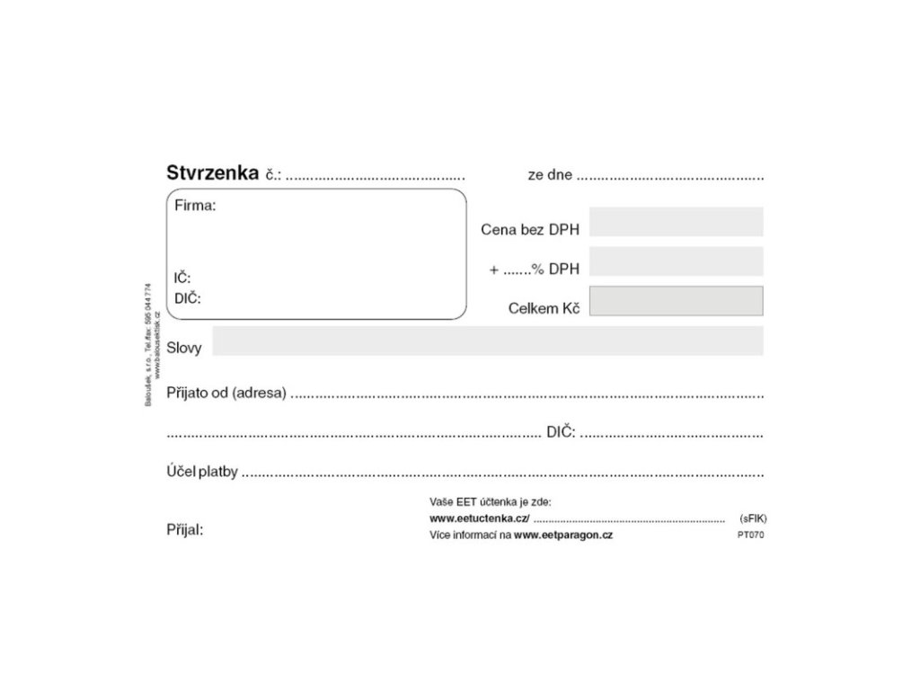 Přímopropisující tiskopis. Vnitřní listy s černým tiskem. Lepený blok. Formát A6.Doplňkové parametry