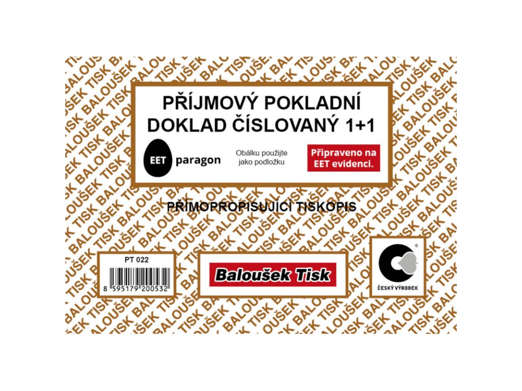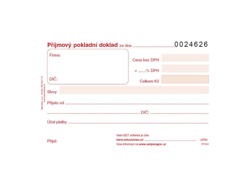 Přímopropisující tiskopis. Je přizpůsoben pro EET evidenci. Vnitřní listy s červeným tiskem. Lepený blok. Formát A6.Doplňkové parametry