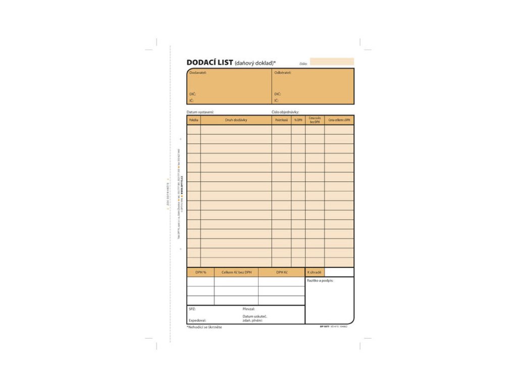 tiskopis splňuje všechny platné požadavky zákona o DPH, samopropisovací (NCR), nečíslovaný, formát A5 na výšku, obsahuje 100 listů odtržitelných perforací, se zakládacím děrováním, perforace v levé části tiskopisuDoplňkové parametry