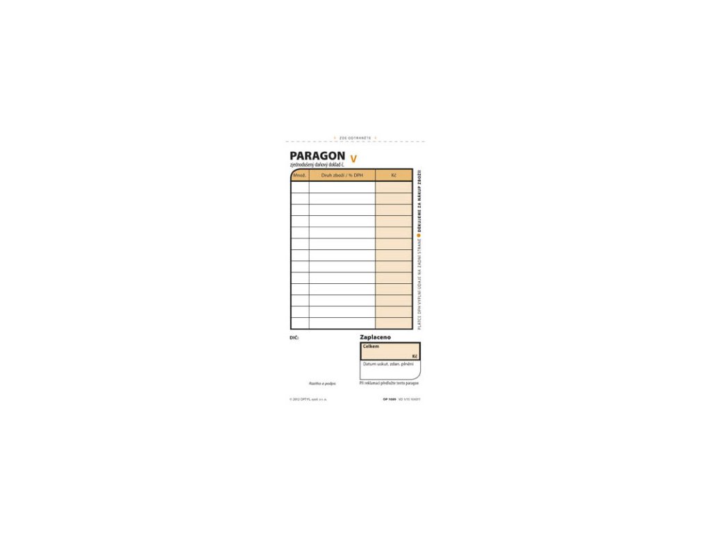 tiskopis splňuje všechny platné požadavky zákona o DPH, samopropisovací (NCR), číslovaný, formát 75 x 150 mm na výšku, obsahuje 2 x 50 listů odtržitelných perforacíDoplňkové parametry