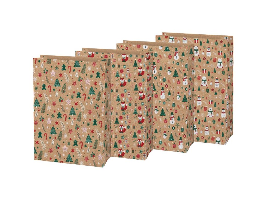 Darujte dárky s elegancí a bez složitého balení. Vánoční dárkový papírový sáček KRAFT 4 z pevného, ekologického papíru v přírodní hnědé barvě je krásnou a zároveň praktickou volbou. Barevné vánoční motivy – od stromečků a sněhuláků až po roztomilá zvířátka či perníčky – dodají každému dárku sváteční kouzlo. Sáček je ideální pro cukroví, menší hračky, kosmetiku, dekorace nebo firemní dárkové balíčky. Je bez uch, proto slouží jako stylový obal, ve kterém se dárek snadno a elegantně předá. Stačí vložit dovnitř – a máte hotovo.Doplňkové parametry