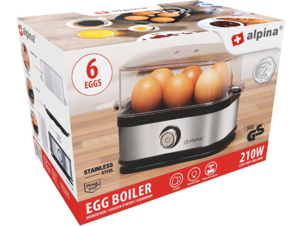 S elektrickým vařičem vajec Alpina můžete uvařit až 6 vajec současně přesně tak, jak je máte rádi. V návodu najdete, jak dlouho potřebujete vařit počet vajec v elektrickém vařiči najednou na požadovanou úroveň. Přiloženou odměrkou se špendlíkem na vejce provrtejte ve vejcích dírku, abyste zabránili prasknutí během vaření. Výrobek má kontrolku, která signalizuje, kdy je připraven k použití. Poté, co jsou vejce hotová, můžete je snadno vyjmout z vařiče vajec pomocí vyjímatelné skořápky.