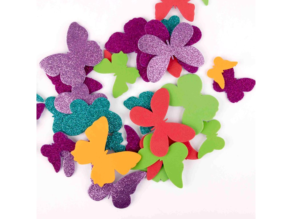 Pěnovka ve tvaru motýlů, v různých barvách a velikostech, některé s třpytivým povrchem. Vhodná pro dětské tvoření, edukační hry a dekorace.Doplňkové parametry