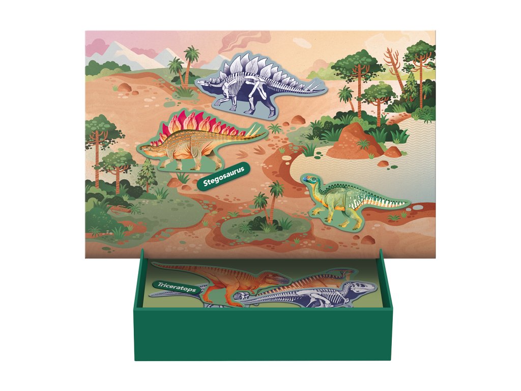 Vydejte se na cestu do pravěku a objevte úžasný svět dinosaurů! Edukační magnetická sada pro děti obsahuje magnety a magnetickou podložku a informační karty v češtině (a dalších 18 jazycích), která dětem přiblíží zábavnou formou důležitá fakta o dinosaurech. Elegantní balení, skvělý dárek pro zvídavé děti.Doplňkové parametry