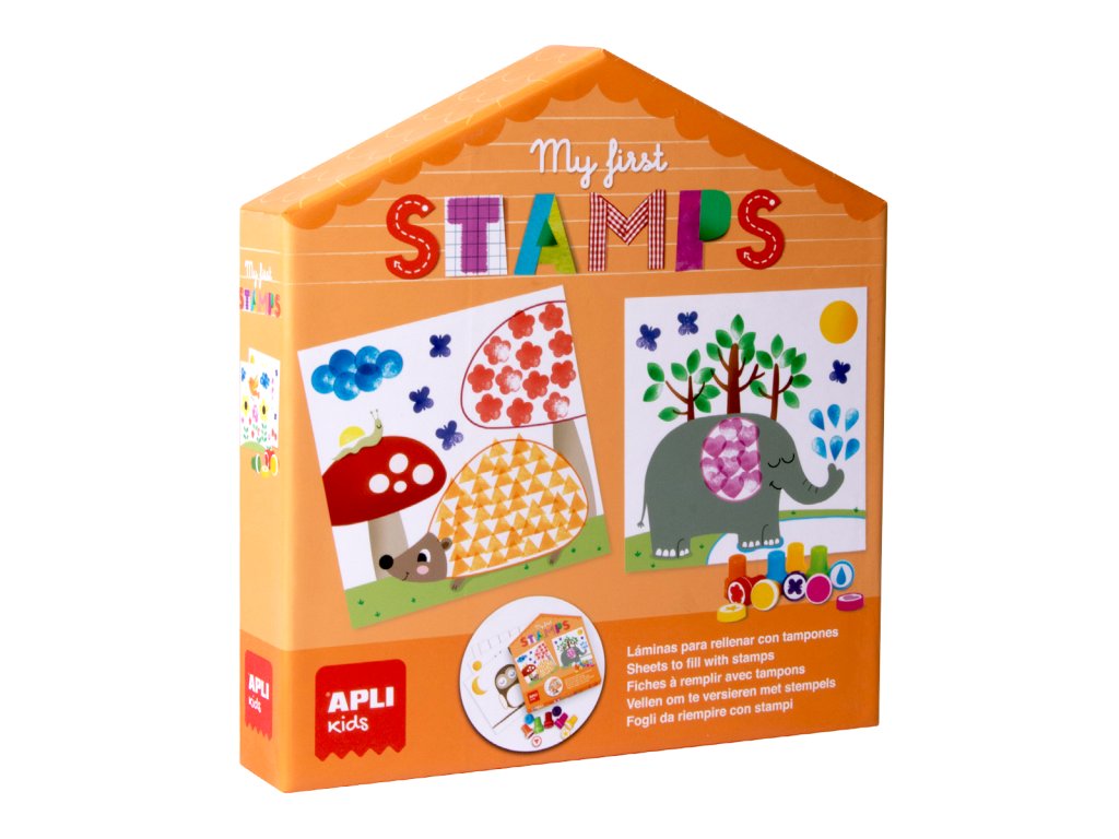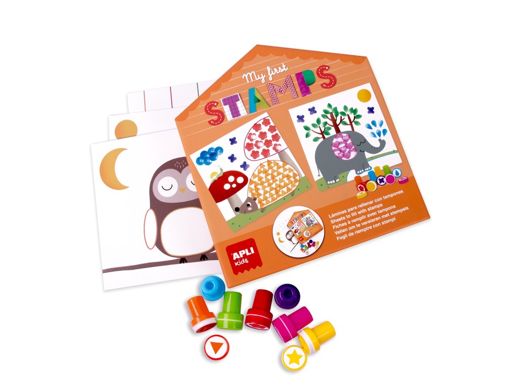 obsah sady: | 8 archů s motivy zvířat, 10 barevných razítek, brožuru s příklady |