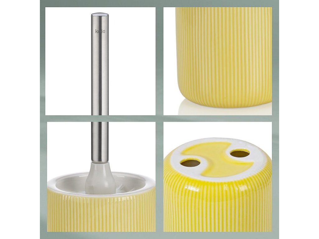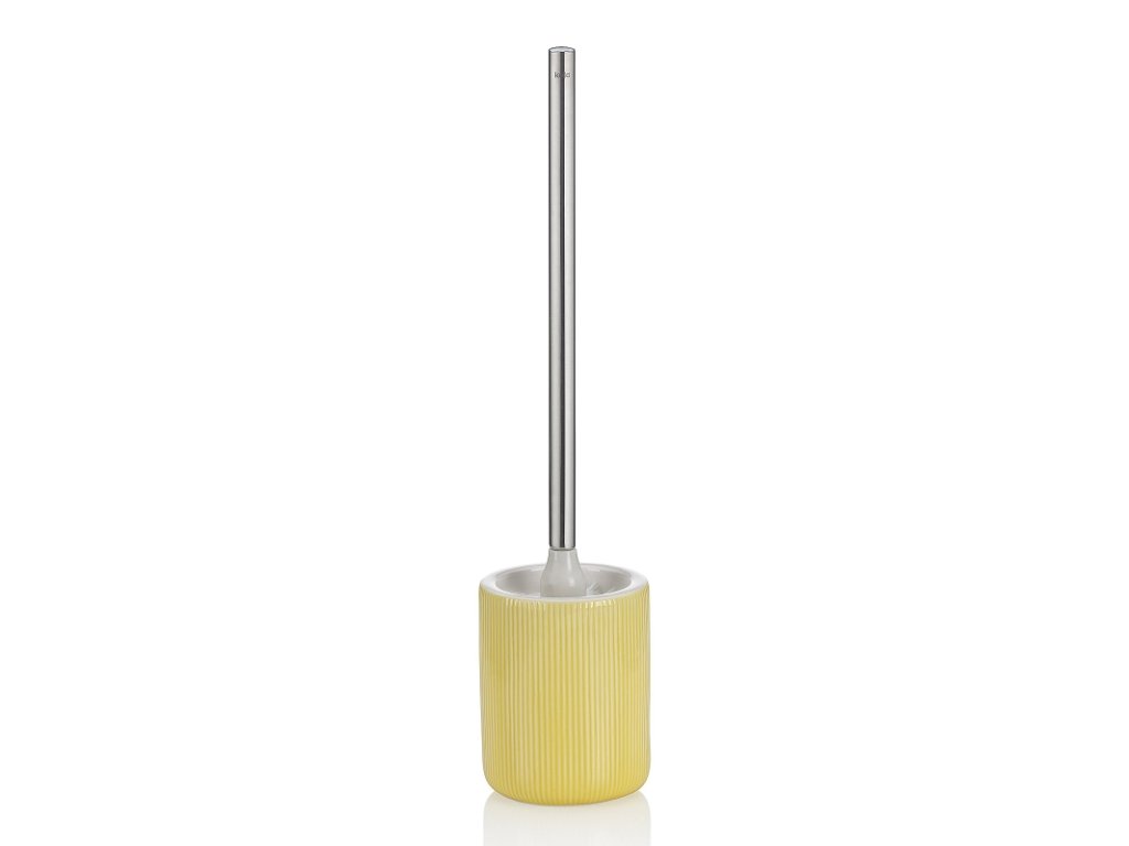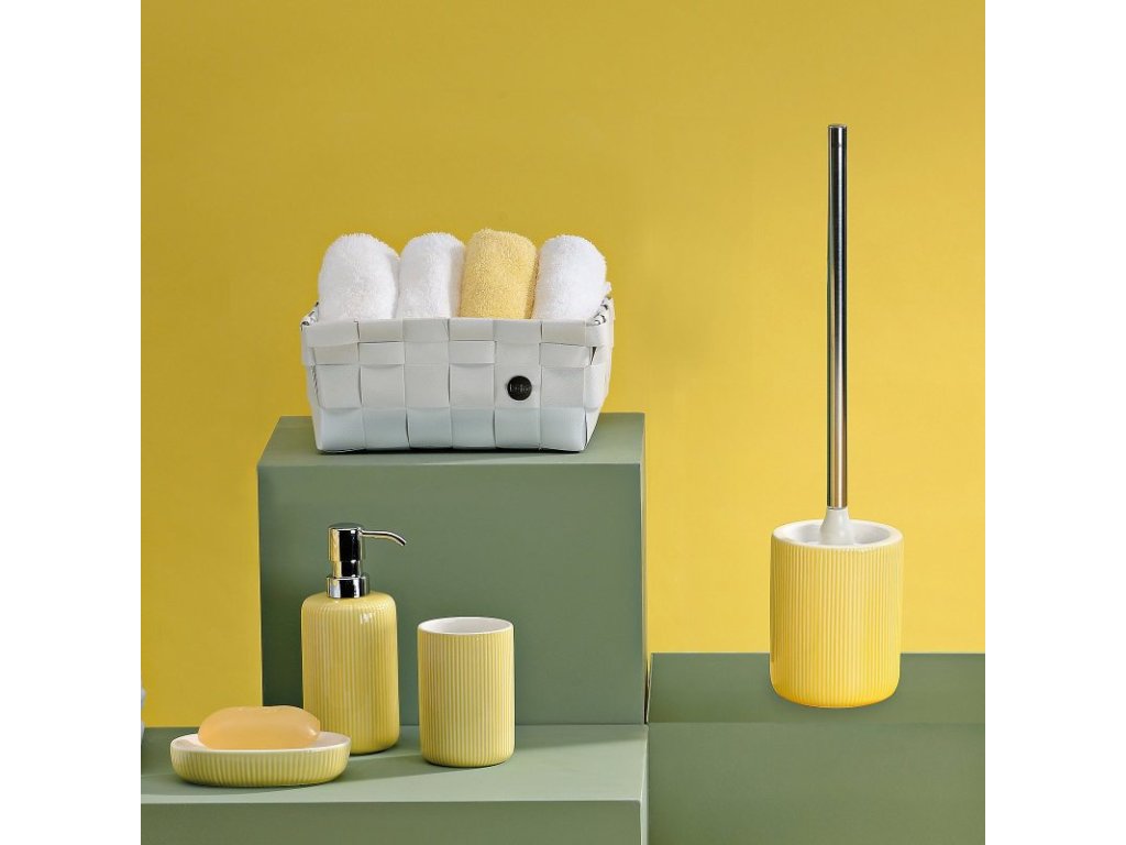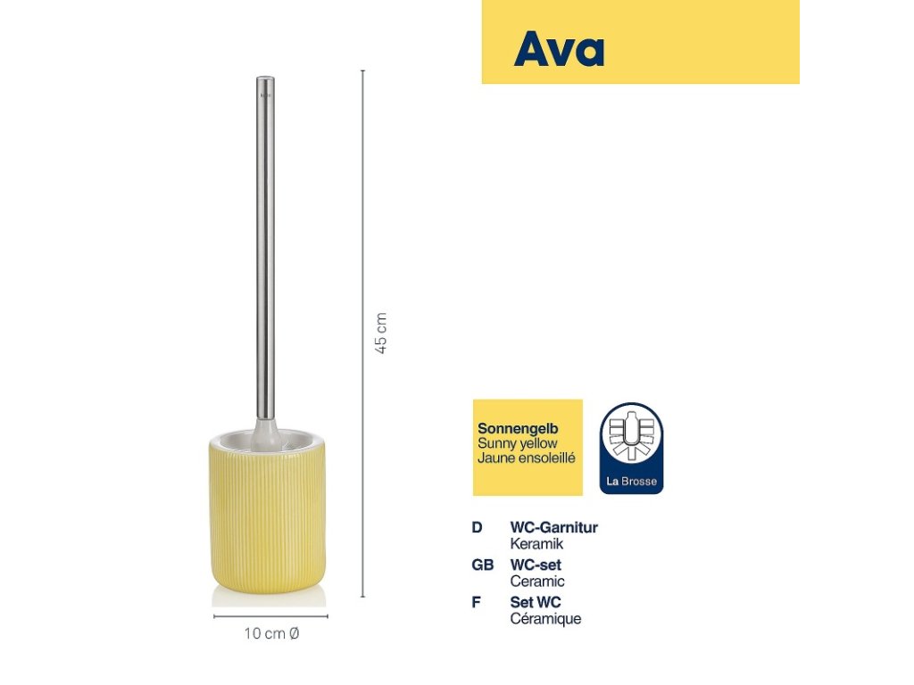 Toaletní sada Ava je vyrobená z keramiky a ve slunečně žluté barvě oživí vaši koupelnu. Rukojeť toaletní štětky je vyrobena z lesklé nerezové oceli, což dodává eleganci a zároveň je praktická. Toaletní set vybavený kartáčem La Brosse v elegantní černé barvě, který můžete snadno odšroubovat a kdykoli vyměnit.