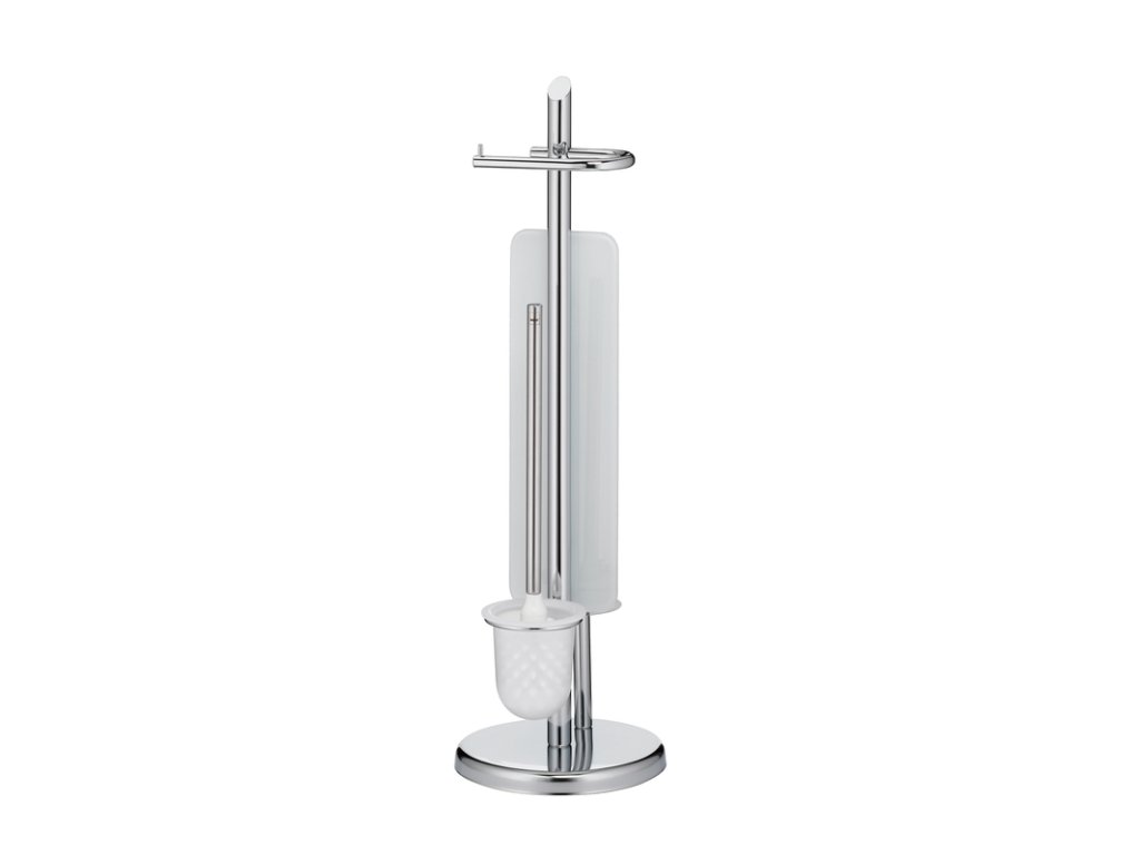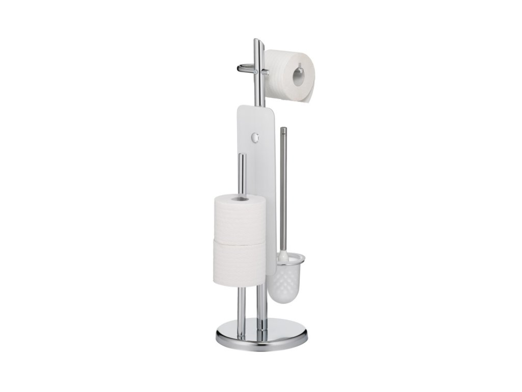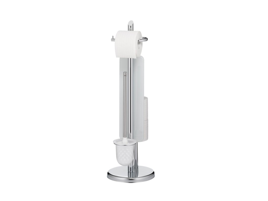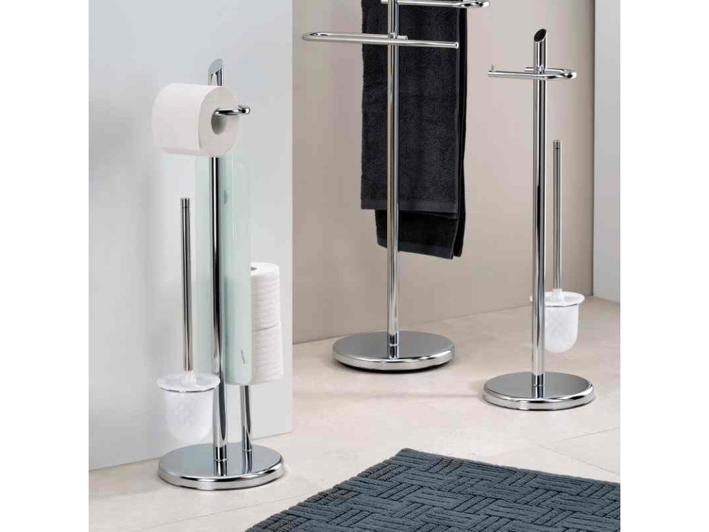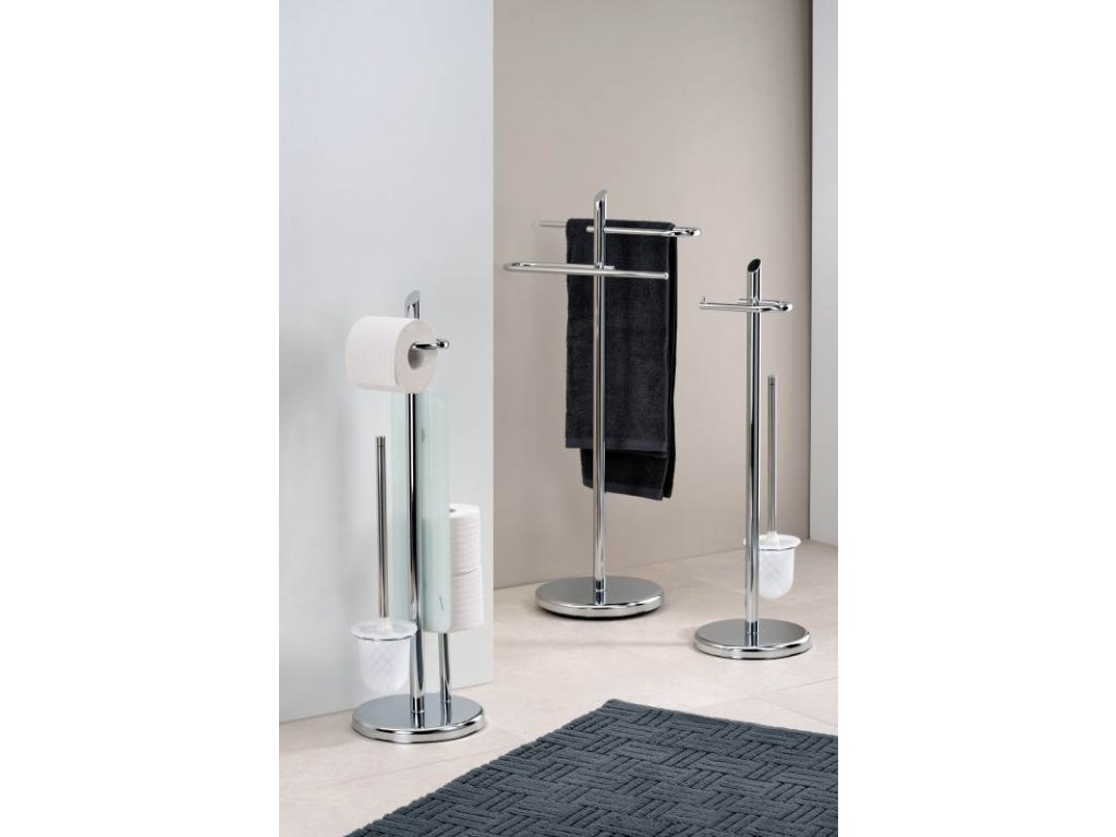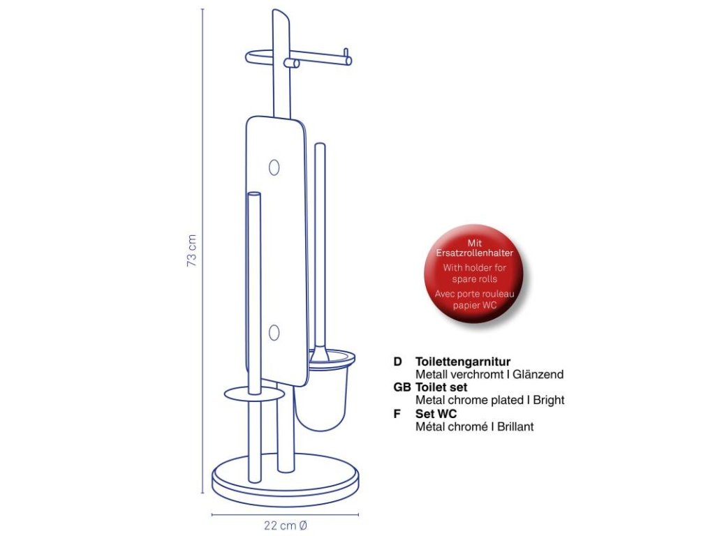 Kovová toaletní sada Ken ve stříbrné barvě s lesklým chromovým povrchem se hodí k mnoha stylům zařízení. Díky zaobleným prvkům základní desky, tyče a držáku papíru vypadá tato sada stojanů moderně a dynamicky. Varianta: stříbrná, výška: 73 cm, průměr základní desky: 22 cm. S nádobou na kartáč z plastu.S náhradním držákem role kovový chromovaný lesklý 22 cm , 73 cm vDoplňkové parametry