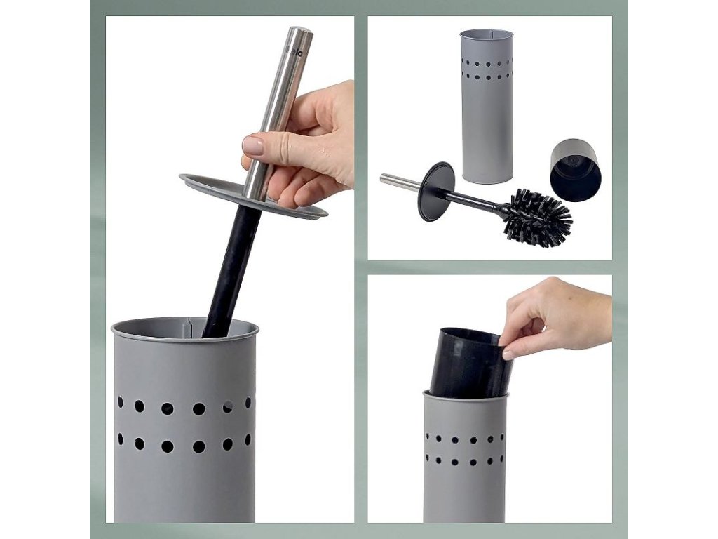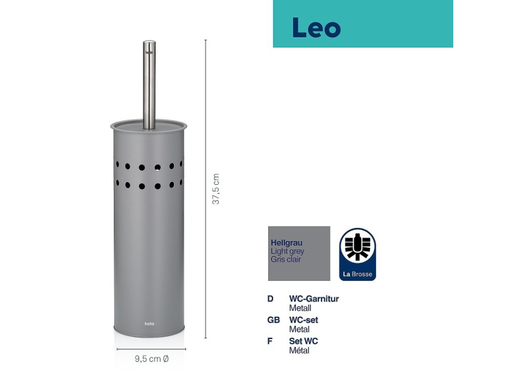 Uzavřená toaletní souprava Leo je vyrobena z kovu s práškovým nástřikem a zdobená perforovaným vzorem po celém obvodu. Rukojeť toaletní štětky je z nerezové oceli a lze ji v případě potřeby vyměnit stejně jako hlavici štětky. Vnitřní plastová nádoba zachycuje odkapávající vodu a lze ji snadno vyjmout pro vyprázdnění a čištění.