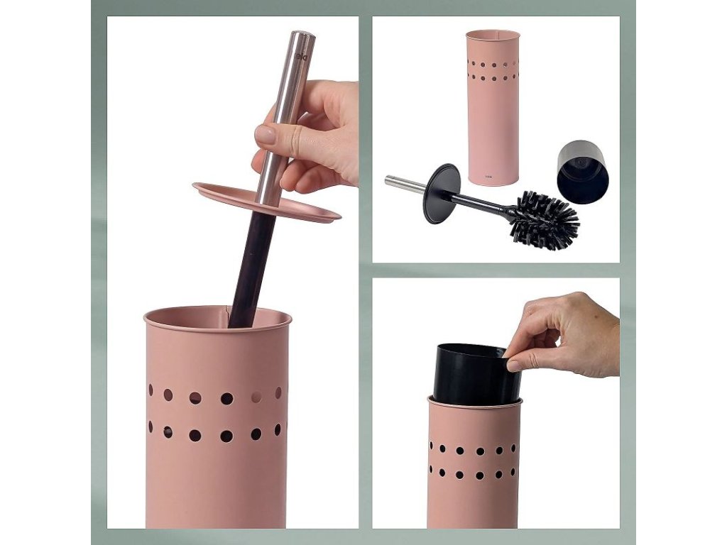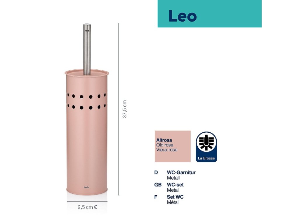Uzavřená toaletní souprava Leo je vyrobena z kovu s práškovým nástřikem a zdobená perforovaným vzorem po celém obvodu. Rukojeť toaletní štětky je z nerezové oceli a lze ji v případě potřeby vyměnit stejně jako hlavici štětky. Vnitřní plastová nádoba zachycuje odkapávající vodu a lze ji snadno vyjmout pro vyprázdnění a čištění.