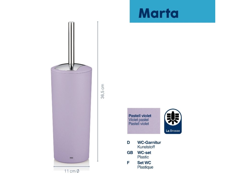 Sada WC kartáčů Marta přináší výrazné barvy a styl do každé koupelny nebo WC. Tento toaletní set je vyroben z kvalitního plastu s matným povrchem, což zajišťuje moderní vzhled a snadnou údržbu.