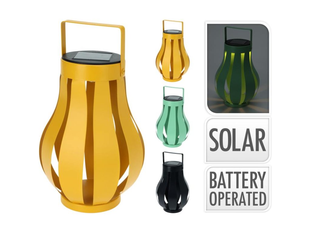 solární lucerna, železná, rozměr průměru 15x19,5cm, s 1 teplou bílou led diodou, s amorfním solárním panelem 45x45mm, 1x 1,2v aa ni-mh 200mah dobíjecí baterie, 3 různé barvy: černá, zelená a okrově žlutáDoplňkové parametry