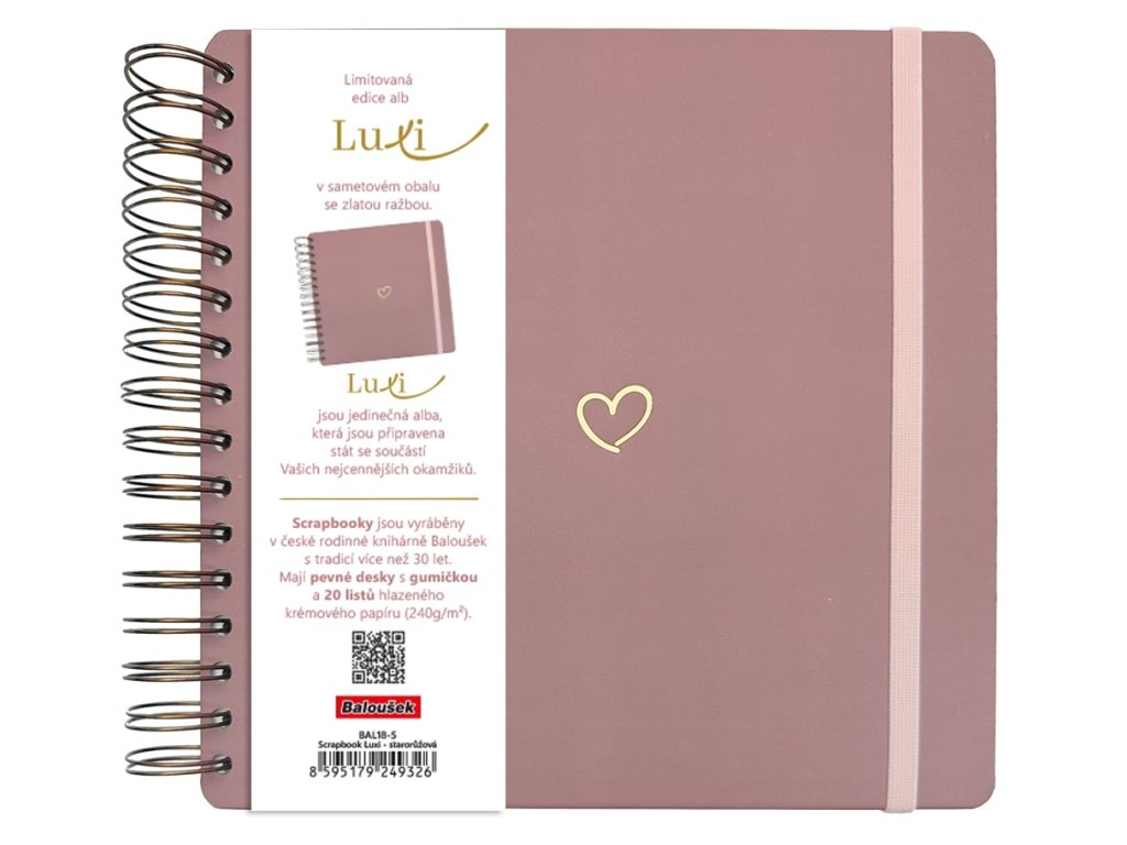 limitovaná edice scrapbooků se sametovým přebalem v moderní starorůžové barvě a se zlatým motivem Srdce, jedinečná alba Luxi s krémovým papírem, kroužkovou vazbou a gumičkou pro všechna vaše tvoření, ručně vyráběná v České republice, pevné desky s gumičkou, uvnitř 40 stran 240g papíru umožňujících vlepování fotografií i psaní různými popisovači, počet stran je přizpůsoben spirále tak, aby se album i po zaplnění pohodlně uzavíralo, krásná a trvanlivá alba připravená stát se součástí vašich nejcennějších okamžiků, rozměry 210×210 mm, 20 listůDoplňkové parametry